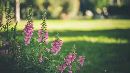 A stunning display of pink foxglove flowers stands tall in a lush green garden. The vibrant blooms create a serene and peaceful atmosphere, perfect for nature lovers.