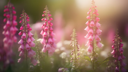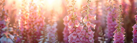 A field of pink foxglove flowers is bathed in the warm light of the setting sun. The flowers are in full bloom, with their delicate petals unfurling in the gentle breeze. The soft light creates a dreamy, ethereal atmosphere.