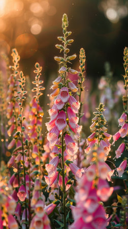 A field of pink foxglove flowers, bathed in the warm glow of the setting sun. The delicate petals of the flowers are illuminated by the golden light, creating a beautiful and ethereal scene.