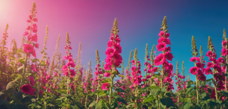 Pink hollyhock flowers on a meadow in summer.