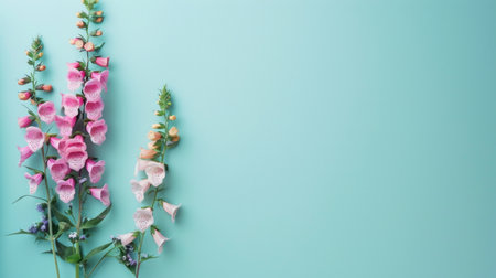 Flowers composition. Digitalis purpurea or foxglove flowers with green leaves on pastel blue background. Flat lay, top view, copy space