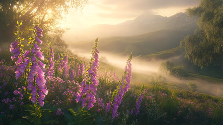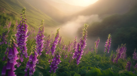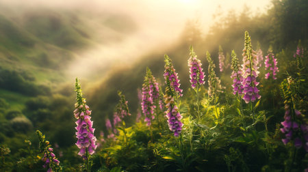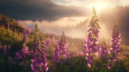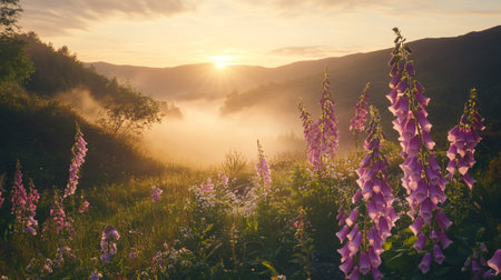 Sunrise in the mountains with pink flowers of foxglove and fog