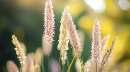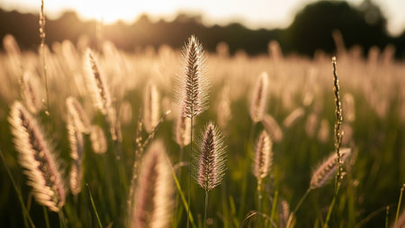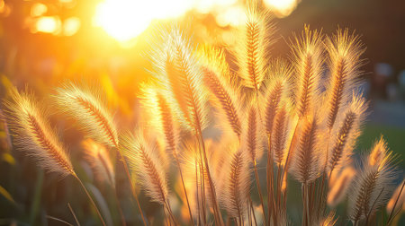 A breathtaking view of feathery grass blades glowing in warm sunlight at sunset, creating a serene atmosphere perfect for nature lovers and photographers.