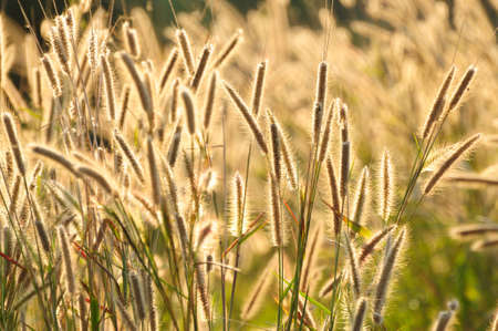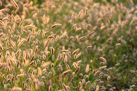 Close-up Beautiful African fountain flower blooming grass field with sunset light on background. Poaceae Grass Flowers, select focus only on some point