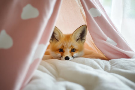 A curious little fox peeks out from a soft pastel tent, nestled on a fluffy white surface in a playful indoor space, radiating a cozy atmosphere.