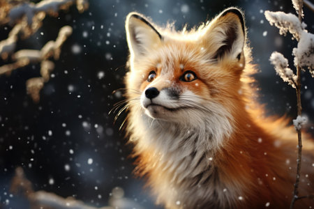 Close up view of a red fox, its fur dusted with snow, capturing the essence of a serene winter wonderland scene