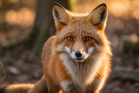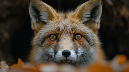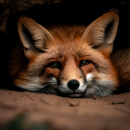 A stunning portrait of a red fox displaying its vibrant fur and captivating eyes, captured in its natural habitat. The soft sunlight contrasts beautifully with the dark background, highlighting the fox's features and creating a serene atmosphere.