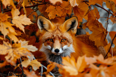 A fox is hiding in the leaves of a tree. The fox is brown and has a black nose. The leaves are orange and yellow, and they are scattered all over the ground. The image has a warm and cozy feeling