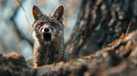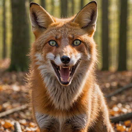 a fox gazes into the woods, mouth wide open, in a cinema4d-rendered image. the selective focus and photo-realistic techniques capture the fox's soggy and playful expressions. the hyperrealistic marine life and rtx effects add depth to the scene. ai generated