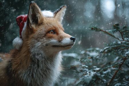 Fox wearing a Santa hat in a snowy forest captures the holiday spirit during Christmas season with a charming atmosphere and enchanting surroundings