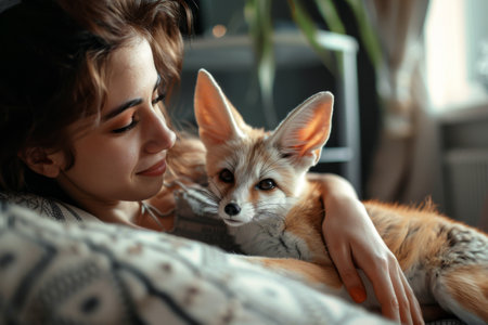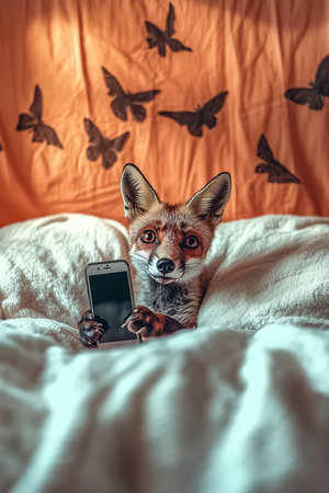 A charming fox with bright eyes holds a smartphone, surrounded by soft bedding and a butterfly motif. The cozy atmosphere adds a whimsical touch.