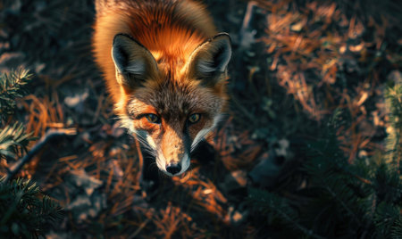 An AI generated illustration of a red fox staring straight ahead while looking upwards