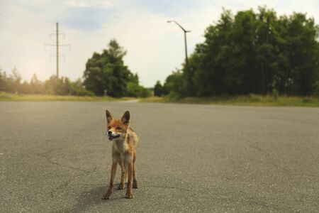 A beautiful young fox walks in the yard of a private house. Selective focus. High quality photo