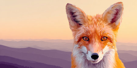 A fox with alert eyes gazes forward. Background shows mountains in hazy purple tones at sunset