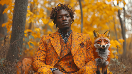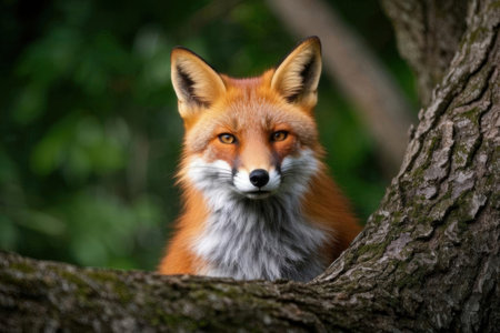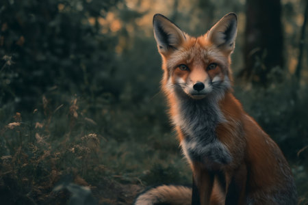 Wild red fox sitting gracefully in the forest, showing its beauty and cleverness while blending seamlessly into its natural habitat