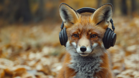 Red fox listening to music with headphones in autumn forest. Close-up.