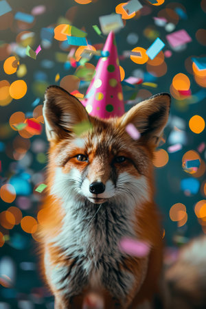 A joyful fox wearing a vibrant party hat, celebrating at a fancy New Year or birthday party, surrounded by sparkling bokeh lights and colorful paper shoot confetti.