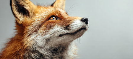 A stunning wildlife portrait of a red fox with thick orange fur and sharp features, gazing upward. Captured in soft studio lighting against a clean background, exuding elegance.