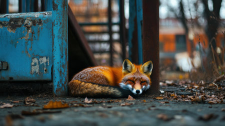 A fox is curled up and resting close to a metal support beam at an abandoned playground. The ground is covered with fallen leaves while buildings are visible in the background.