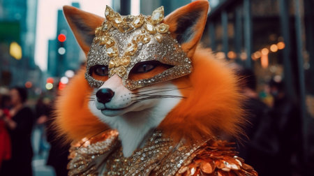 An AI generated illustration of a fox dressed up in shiny clothing with a mask on it