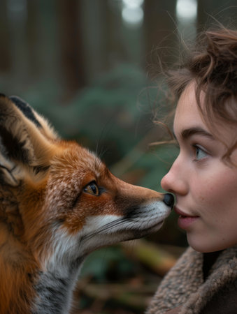 This close-up image showcases the captivating beauty of a red fox with striking fur in a tranquil woodland environment. Perfect for nature enthusiasts.