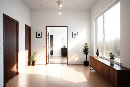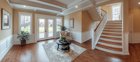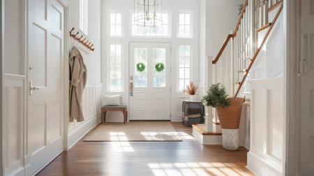 A spacious interior hallway is illuminated by natural light and features a staircase leading upwards. The scene includes a decorative cabinet, artwork, and a plant arrangement. Warm wood flooring complements the neutral color palette. This image is suitable for architectural, design, or lifestyle publications and commercial use.