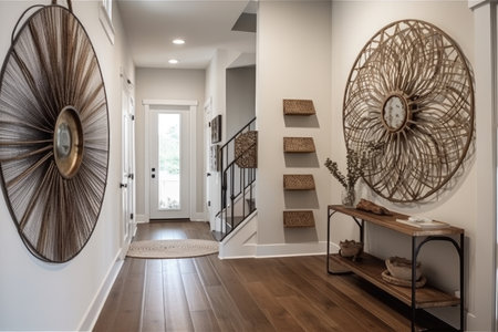 sculpted metal wall art decorates the entryway of a bohemian home, with wooden floors and neutral walls, created with generative ai