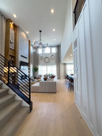 Castle Rock CO USA-April 29, 2025 - Spacious modern home interior with open concept layout featuring a cozy living room, sleek kitchen, and contemporary decor elements. Natural lighting, elegant wood flooring, and high ceilings create a luxurious and welc