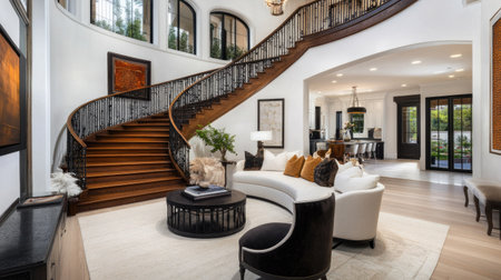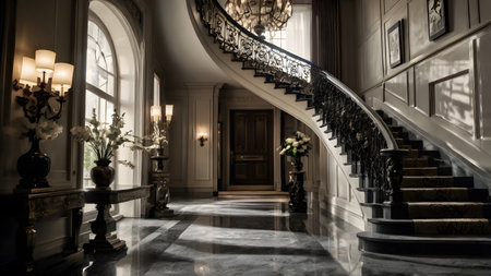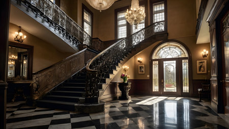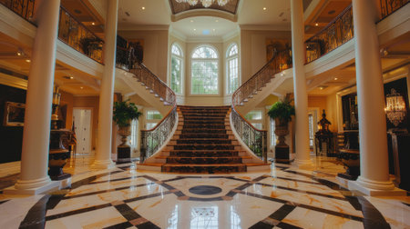 This image depicts the grand and opulent interior of a historical mansion,showcasing its impressive architectural features and lavish furnishings The spacious foyer features a stunning spiral