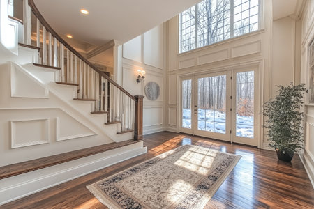 A large, elegant entryway with a white staircase and dark wood floors in an upscale home interior design. --ar 3:2 --stylize 750 --v 6.1 Job ID: e5e39518-752e-4bba-a295-b4ec66505357