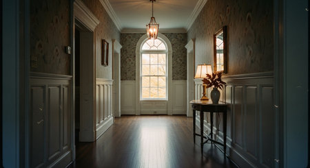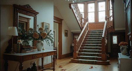 This image showcases the interior of a grand and opulent mansion,featuring a stunning hallway with intricate architectural details,including a magnificent staircase,ornate wood paneling,and a