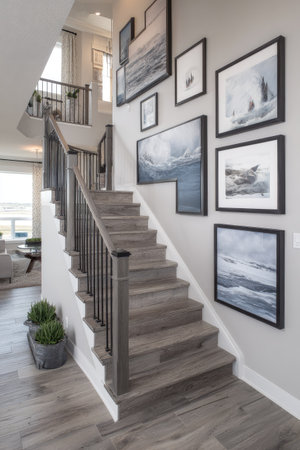 An indoor staircase ascends against a wall displaying framed art pieces. The scene showcases a modern interior design with neutral color tones. The composition uses leading lines to draw the eye. Suitable for use in architecture, design, or lifestyle publications.