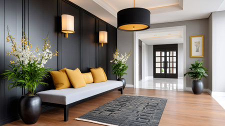 Hallway interior design showcasing a modern bench, dark wall, pendant light, and decorative plants