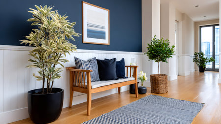 Bright hallway interior decorating with houseplants, wooden bench, striped pillows, and wall art