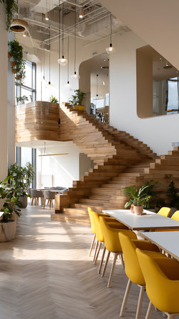 Beautifully lit, modern office space featuring a unique wooden staircase, large windows, and pops of color from yellow chairs. Interior is filled with plants and natural light.