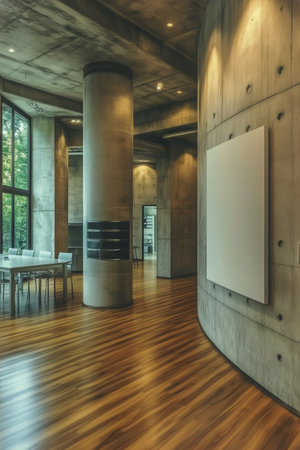 Spacious room showcases minimalist architecture with concrete walls and wooden flooring. Large windows provide natural light, enhancing the contemporary atmosphere.