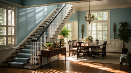 Interior of a classic wooden staircase in a house with large windows