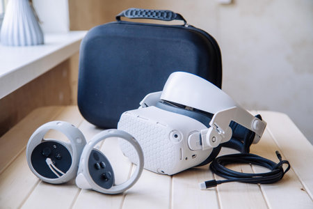 Virtual reality headset lying on wooden table with controllers and case