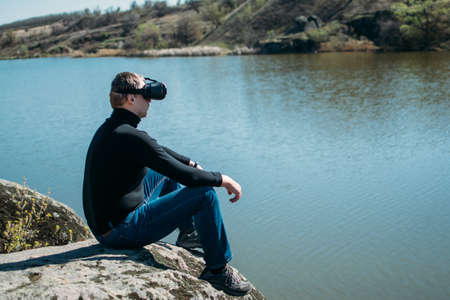 Virtual reality vs real life. Future, Modern technologies. Man in VR virtual reality glasses on the nature background by the river in sun day.