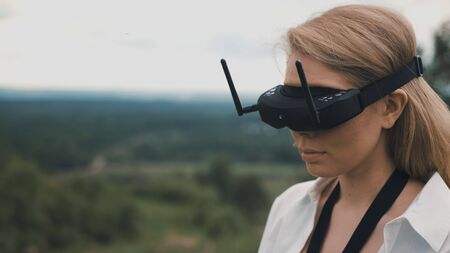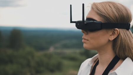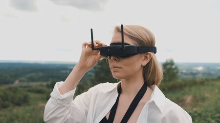 Girl puts on black FPV goggles to control the drone