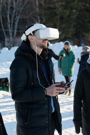 Arkhangelsk, Russia - July 9, 2019: Man controlling custom made dron by virtual reality glasses