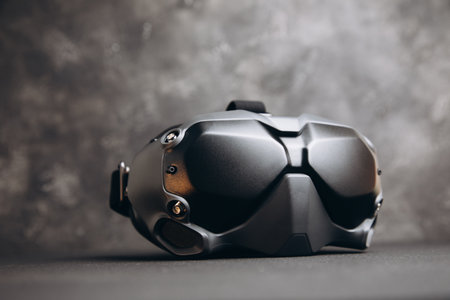 Close-up of black virtual reality glasses on a dark concrete background. Glasses for controlling drones. Front view