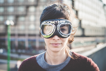 young beautiful hipster woman success aviator glasses in the city