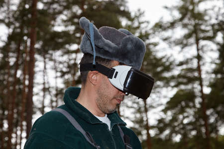 Mushroom picker and virtual reality. A man wearing virtual reality glasses in the forest near a campfire.