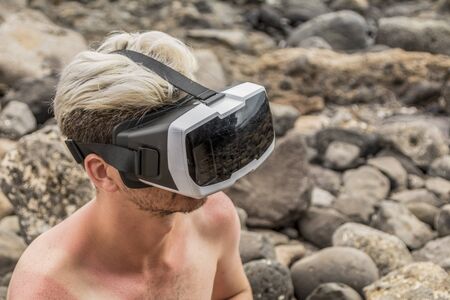 Man sitting on the rocks using a virtual reality headset.