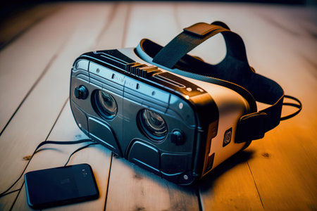 shot of a vr headset next to a gamepad, created with generative ai