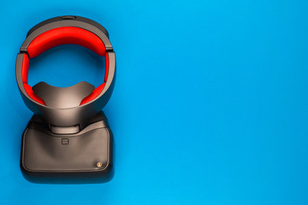 A new and amazing vr set on blue background, shot from above, aligned at the top right.