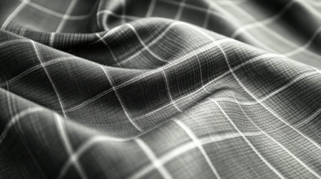 This image features a close-up of an elegant grey fabric with a subtle checked pattern, showcasing a smooth texture ideal for fashion design and tailoring.