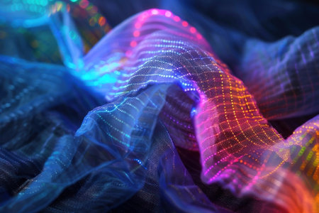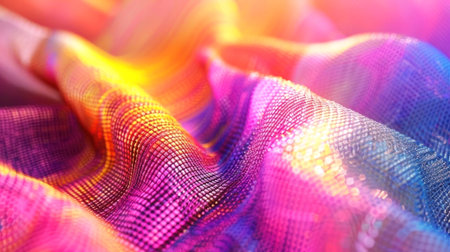Vibrant and colorful textile pattern with dynamic waves and shimmering light, evoking feelings of energy and movement. Perfect for inspiration and creativity. Generated A.I.