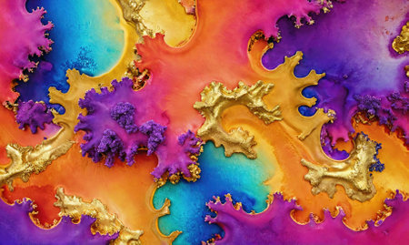 A close-up shot of abstract art featuring swirling shades of purple, orange, blue, and gold